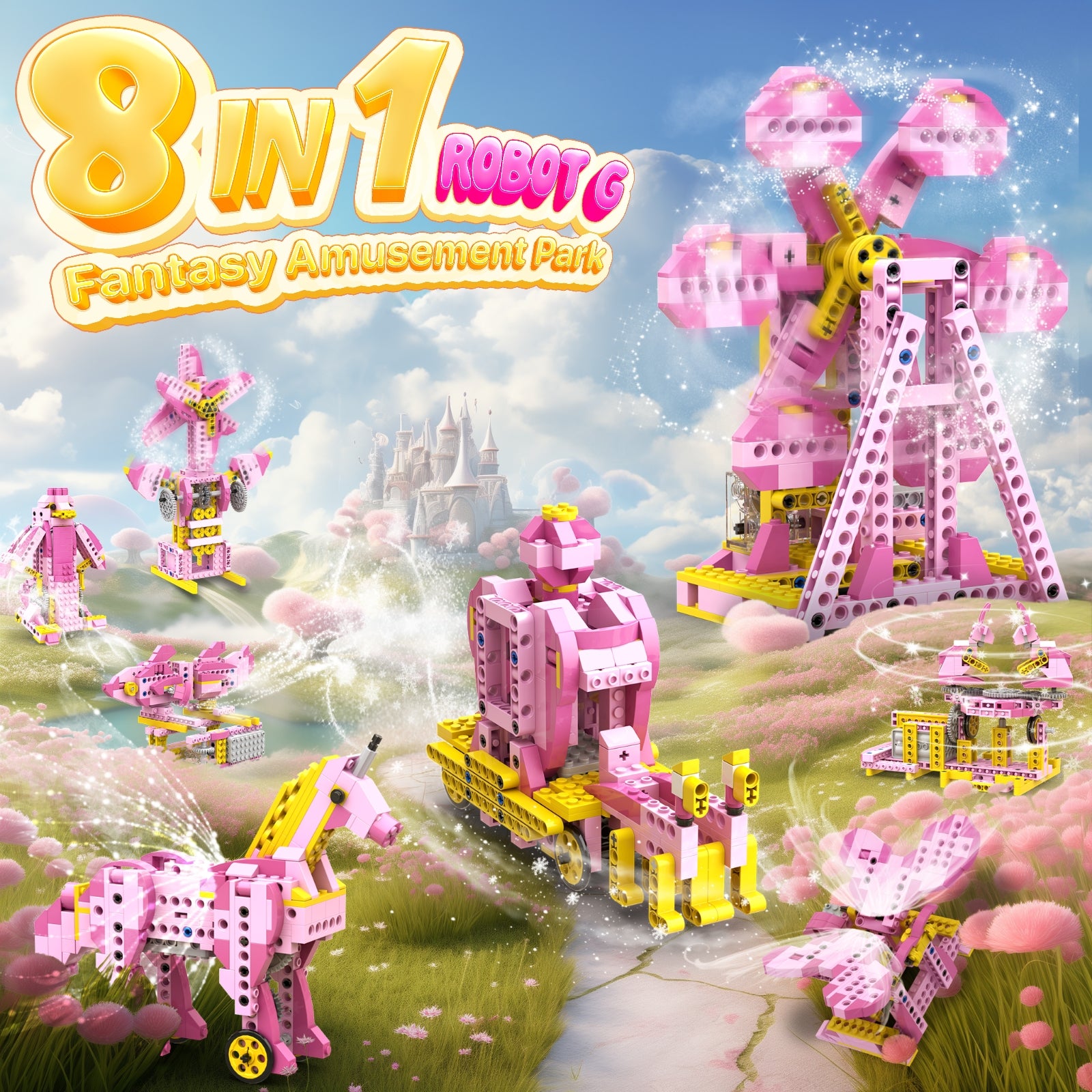• 【 Learn by Playing 】The 8-in-1 pink amusement park building block kit is a fantastic toy that combines creativity, education, and play. Encourage your kids to build their own robots and enjoy DIY science activities. By playing with these electric robots, children's curiosity and interest in physics will be stimulated, and they'll know how much fun it is to create a robot by themselves.